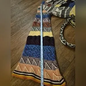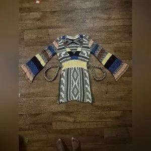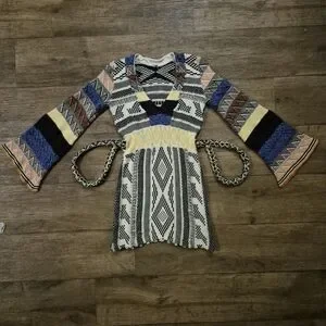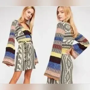 FREE PEOPLE XS Multicolor Patchwork Long Bell Sleeve Sweater Dress This stylish multicolor patterned dress features a unique design with a blend of vibrant colors. Perfect for any occasion, it offers a comfortable fit and a chic look.