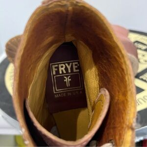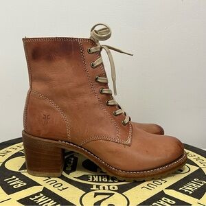Frye Sabrina 6G tan leather lace up heeled combat boots. Has some scuffs, discolouration and there’s an indentation in one toe as shown in photos - please review all photos. Women’s size 8 M.