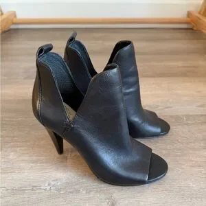 Step out in style with these elegant black leather peep-toe booties. Perfect for any occasion, these shoes offer both comfort and sophistication.
