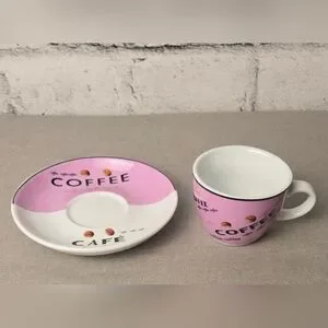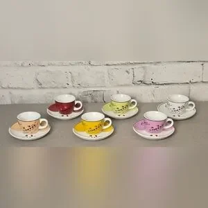 Charming vintage-style coffee / café cup and saucer set featuring six matching pairs in a cheerful mix of colors. Each cup is paired with its coordinating saucer and features playful coffee-themed text and graphics, giving the set a cozy European café vibe. Perfect for espresso, cappuccino, or small coffee servings, this set works beautifully for entertaining, display, or everyday use. The mismatched-but-coordinated color palette makes it especially appealing for retro kitchens, coffee bars, or brunch tables. Set Includes: • 6 coffee cups • 6 matching saucers Details: • Style: Vintage café / espresso style • Colors: Assorted multicolor set • Material: Ceramic • Design: Coffee-themed text and graphics • Ideal for: Espresso, cappuccino, or café-style coffee Condition: Very good vintage condition. No chips or cracks noted on cups or saucers. Colors remain bright and clean. Please review all photos for exact condition and sizing. A fun and functional set for coffee lovers, vintage tableware collectors, or anyone looking to add personality to their coffee routine. #vintagecups #coffeecups #cafestyle #espressocups #vintagetableware #coffeeset #multicolorkitchen #teacupsandsaucers