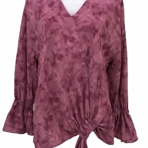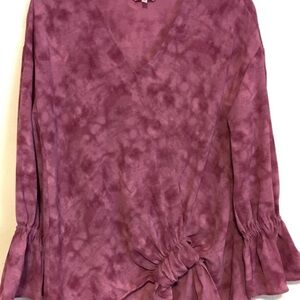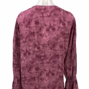 Chic rose tie-dye blouse with a wrap design. Features a V-neck and gathered sleeves. • Size: XL