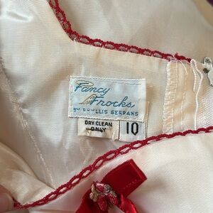 Long, white, double layer dress with red ribbon, crotchet, bow, and rosette details. Marked size 10, fits modern 0 / XS best (modeled on size 2, 5’8”). Brand is Fancy Frocks by Phyllis Gerrans.