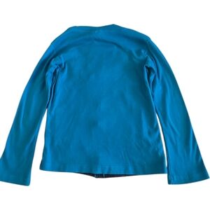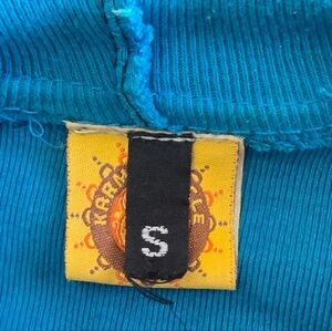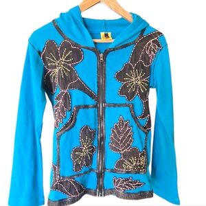 Blue and black made in Nepal hippie Bonaroo festival zip up hoodie jacket. Slightly flared sleeves. Embroidered, patchwork flowers.