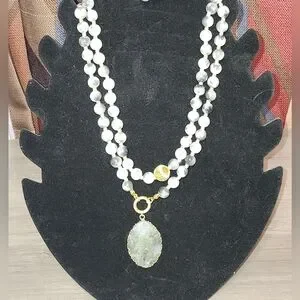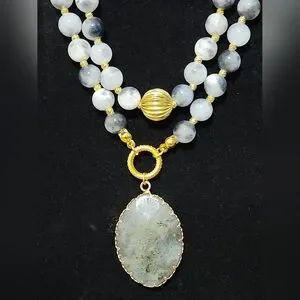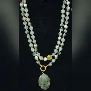 Hand crafted Bohemian style natural Moonstone beaded The beads in the strand is a mix of grey, white, and black gemstones, possibly accented with small gold beads.