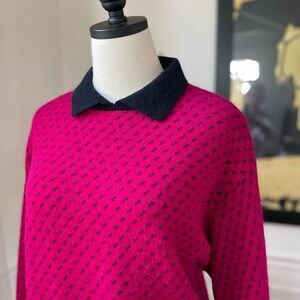 Vintage 1980s boundary waters Sweater and Skirt set from Hudson‘s/Macy’s/Marshall fields (depending on where you lived in the country). Magenta fuchsia hot pink and black with bold geometric pattern around the hem of both the sweater and the skirt. The sweater has a collar. The skirt is sweater knit with a wide band elastic waist. Measurements are approximate and taken while laying flat: Sweater is 23.5 inches from shoulder to hem and 21 from armpit to armpit. The skirt measures 13 inches straight across the waist and 28.5 inches long. It looks like the tag says it is size 16 but if anything that is vintage sizing. Based on the measurements I think it is closer to a modern size medium and it is featured on my size medium dress form for reference where it fits well