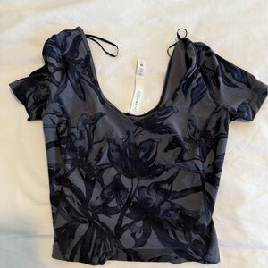 Stylish Lululemon top with a black and gray floral pattern. Perfect for casual wear.