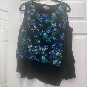 Calvin Klein Women’s Layered Asymmetrical Hem sleeveless floral black size XL blouse. Crew neck pull over.