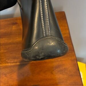 Sleek black leather handbag with logo detail. Ideal for daily use. Rubber bottom. Has scuffs on rubber and some marks on inside of bag . See pictures