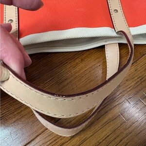 Stylish pink canvas tote with cream trim. Features tan leather handles. Perfect for everyday use.