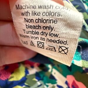 Pullover, mandarin collar, button front closure, button closure cuffs, 100% polyester construction, beautiful floral print, machine washable