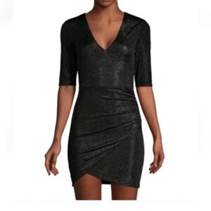 The product is a brand new with tag Alice + Olivia Judy ruched metallic dress in size 10. This bodycon style dress is short in length and features a sleek black color with metallic accents, perfect for adding a touch of glam to any outfit. The ruched detailing adds a unique and stylish element to the dress, making it a perfect choice for a night out or special occasion.