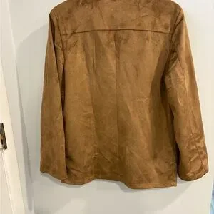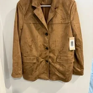 Stylish tan blazer with button closure. Features a classic collar and front pockets. Ideal for versatile wear.