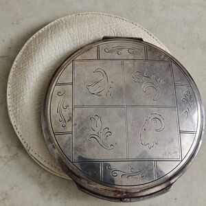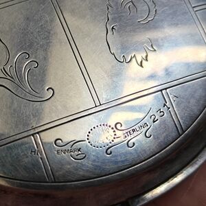For your consideration this fine Georg Jensen sterling silver compact with its original sleeve case. This is a rare and hard to find large size compact (3 3/4 inches) and was designed by Harald Nielsen, circa 40s-50s. The compact features nicely etched on both sides floral and animal motifs: duck, ram’s head, and flowers. The compact is in great condition for the age, original untreated age patination, some light expected surface wear, no dents or scratches noted, the mirror glass appears to be clear, no monograms, it comes . with a powder screen. Marked: “HN ( Harald Nielsen) DENMARK Georg Jensen in an oval STERLING 231A”. Diameter: 3 3/4 inches. A rare estate find, perfect for collectors!