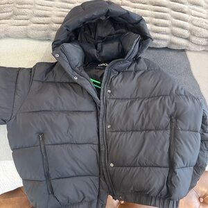 Sleek and warm puffer jacket. Features a cozy hood and zip pockets. Perfect for cold weather.