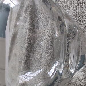 Enhance your home decor with this elegant clear glass vase. Its sleek design adds a touch of sophistication to any room. There are minor scratches in the glass on one side.