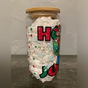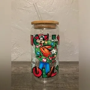 Made with official Disney product. Halloween Glass tumbler featuring Holly Jolly Goofy holding a Christmas wreath. Super cute for the holidays or to give as a gift. Comes with lid, straw, and cleaning brush.