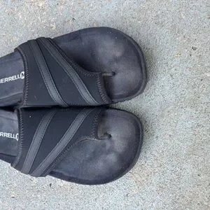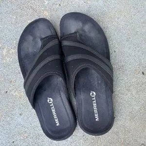 Sleek black flip-flops by Merrell. Ideal for everyday wear. Comfortable and stylish.
