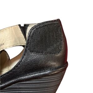 Featuring a solid black color, mid-height wedge heel, and ankle strap closure, these shoes offer both comfort and fashion.