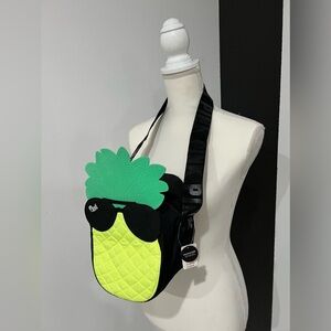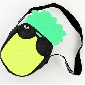 Fun pineapple-shaped crossbody bag. Features quilted yellow body and green top. Black sunglasses detail adds a playful touch. Perfect for casual outings.
