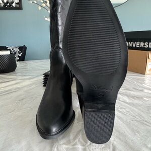 Elegant black over the knee boots with stylish stitching. Perfect for adding sophistication to any outfit.