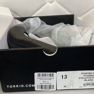 The Torrid Women's Pointed Toe Studied Stiletto Pumps in Black are a stylish and trendy choice for women who want to make a statement at parties or cocktail events. With a stiletto heel and pump style, these size 13 shoes are made of leather with a rubber outsole for comfort and stability. The black color and solid pattern make them versatile for various occasions, while the brand Torrid ensures quality and style. Perfect for summer, fall, or spring, these heels are a fashionable addition to any woman's wardrobe.