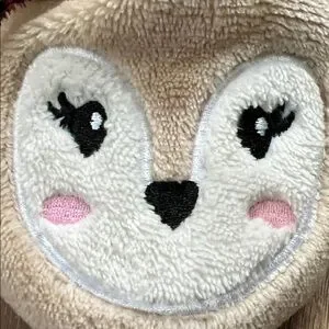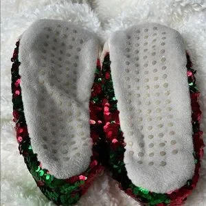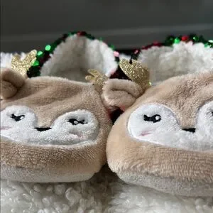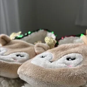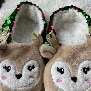 Adorable reindeer slippers with sequin details. Features red and green sequins with tan reindeer faces.
