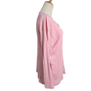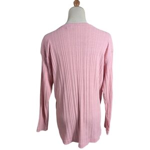 Vintage pink ribbed top with full button-up front. Has stretch. More of a relaxed fit. Good overall condition Tiny light spots near bottom