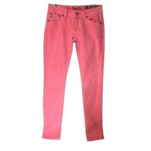 The product is a pair of Miss Me Jeans in a neon melon color, designed for women in size 29 with a skinny style. These jeans have a mid-rise waist with a 10-inch rise and a 33-inch inseam. The pants feature stylish embellishments and a trendy design that is perfect for adding a pop of color and flair to any outfit. Made by the brand Miss Me, these jeans offer a comfortable and flattering fit for women looking for a fashionable and trendy addition to their wardrobe.