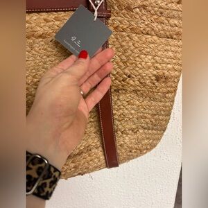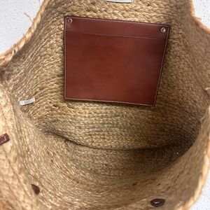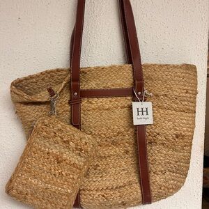 Haute Hippie Straw Woven Raffia Bag Tan Brown Leather Pocket and Trim Tote NWT