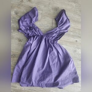 Cutesy purple mini dress, featuring stylish ruffled sleeves, tie-back, and pockets! (YES!) Perfect for any occasion, this dress adds a pop of color to your wardrobe.