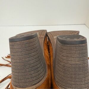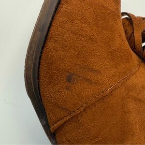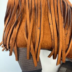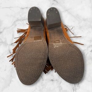Step into boho-chic style with these Mata ankle booties featuring a rich camel brown faux suede finish and eye-catching fringe detail. Perfect for festival looks or Western-inspired outfits. Overall good condition with minor discoloration on a few fringe pieces & minor insole peeling (see photo).