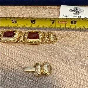 This is a gold-plated bracelet featuring simulated carnelian and diamond-bright crystals, part of the Jacqueline Kennedy Collection by Camrose & Kross. It is 7 inches with a 1 inch extender so it can go to 8 inches gold tone excellent condition.