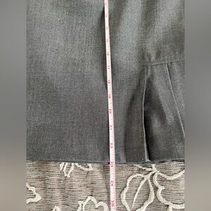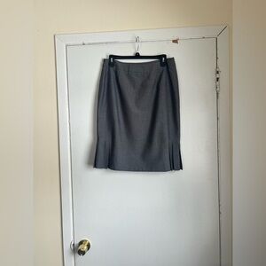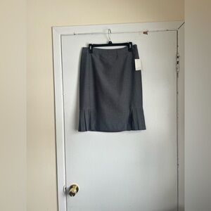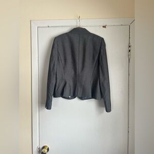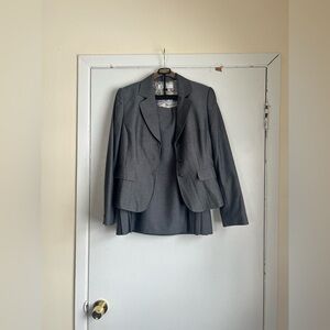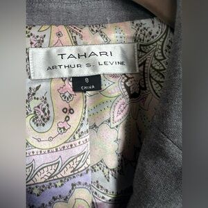 Tahari gray skirt suit. This two-piece set includes a tailored, single-button blazer with a paisley-lined interior and a matching pleated skirt.