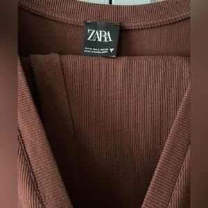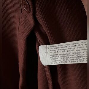 Stylish brown knit set. Includes long cardigan and matching pants. Perfect for a chic look.