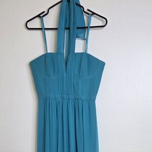 Make a grand entrance in this stunning BCBGMAXAZRIA "Starr" halter gown. Crafted from luxurious 100% silk in a vibrant Bluejade teal, this dress features a sophisticated textured finish and a high-end silhouette.