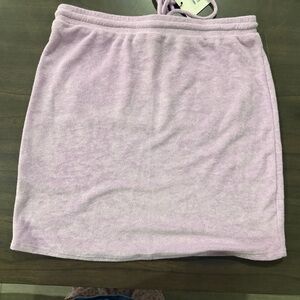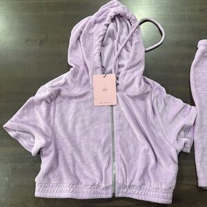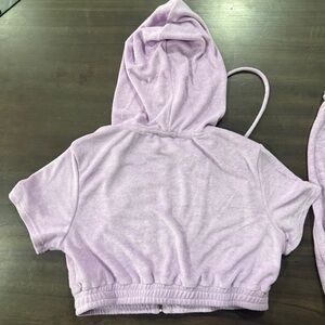 Chic lilac top and skirt set with hood. Includes zip-up top and drawstring shorts. Soft and stylish for lounging or everyday wear.