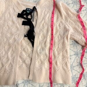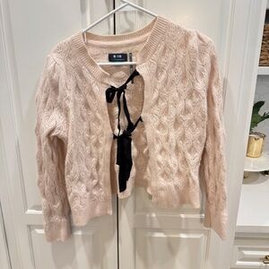 features a delicate knit design with a front bow-tie closure
