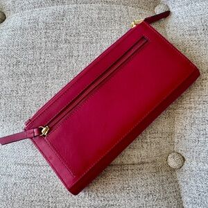 Radley London red leather wallet with gold dog emblem. Sleek and stylish design. NWT.