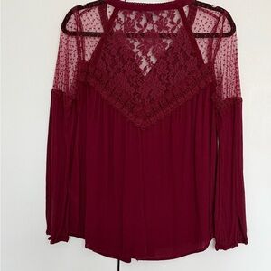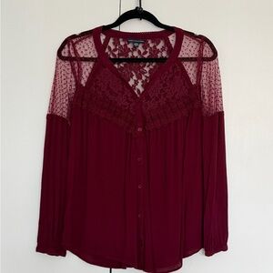AEO burgundy top features delicate lace detailing, long sleeves and button front.