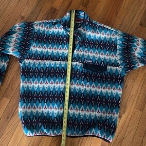 Patagonia xL men’s (or unisex women) check photos for measurements. Cozy fleece with vibrant blue and red pattern with turquoise and white.