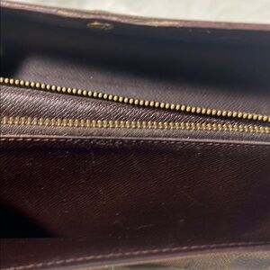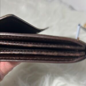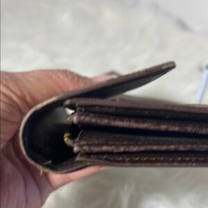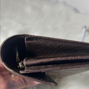 Stylish checkered brown wallet perfect for any occasion. Features a sleek design with a secure closure.two small front pockets for cards. Zippered coin section in center. Has some residue and edge wear. Priced accordingly. See pics. Final sale item.