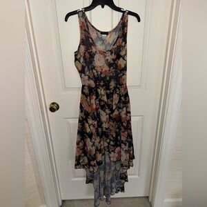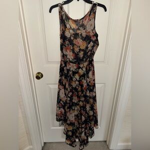 Chic high low dress with floral design. Sleeveless and stylish. Perfect for day or night.