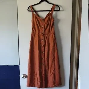 This charming orange button down sundress showcases a flattering midi length complemented by delicate spaghetti straps. It has a playful flair, making it an ideal choice for casual occasions. And best of all it has pockets!!