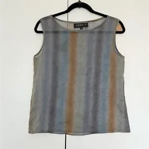 This THEO.S. sleeveless top features a semi-sheer, lightweight slightly textured fabric, in muted vertical stripes in shades of blue, brown, and grey. It has a simple crew neckline and a relaxed, straight silhouette that makes it an ideal layering piece.