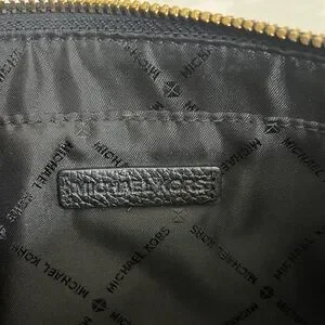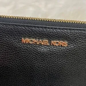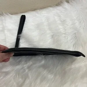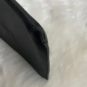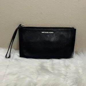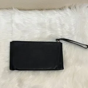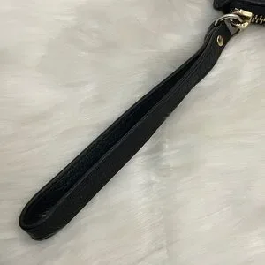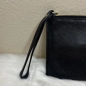 Chic black wristlet with pebbled leather texture. Features gold-tone logo and secure zip closure. No flaws on interior. Approximately 9.75” x 5.5”. Can be dressed up or casual.