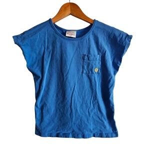 Adorable blue tee shirt from Hanna Andersson, perfect for your little one's wardrobe. This short-sleeved top features a cute pocket detail with a cheerful sun graphic, adding a touch of fun to any outfit. The classic crew neck and comfortable fit make it ideal for everyday wear. Great for playdates, casual outings, or even a day at preschool.