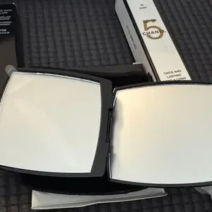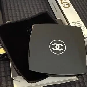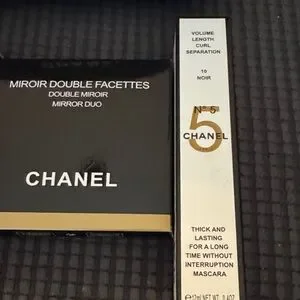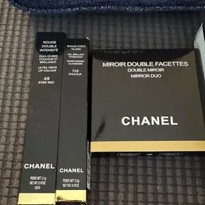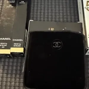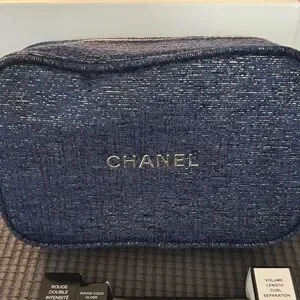 Elegant CHANEL navy bag with a selection of cosmetics. Includes a mirror duo and essential makeup items.
