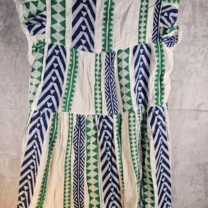 NWT THML dress with a square neckline, flutter fringe sleeves, chevron pattern, bohemian, festival, fully lined. Features blue and green hues, ideal for casual outings. Size M