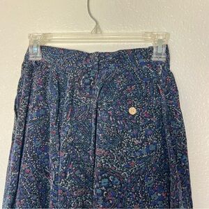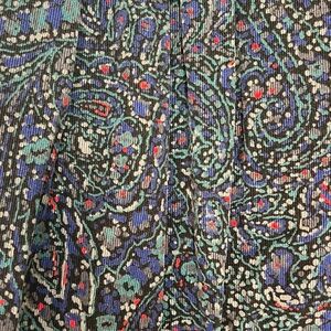 High waist vintage Calvin Klein Sport skirt with pleats and button detail, multicolor blue teal paisley pattern with hints of bright red and gray, plush corduroy cotton fabric, and long midi length