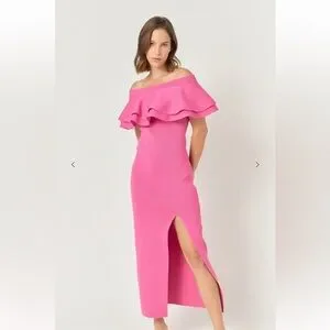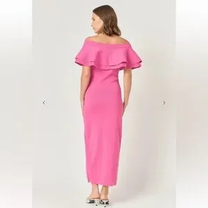 Chic strapless design with ruffle detail. Vibrant pink hue. Ideal for elegant outings. Size small. Purchased from Anthropologie. Only warn once. High leg slit